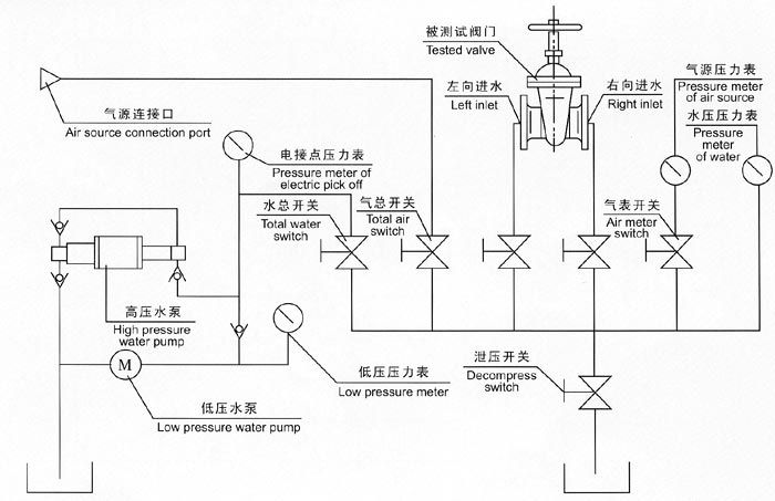 六、液壓供壓水泵開始工作前,先調(diào)節(jié)好電接點壓力表與被試驗閥門壓力相同,然后進行工作。